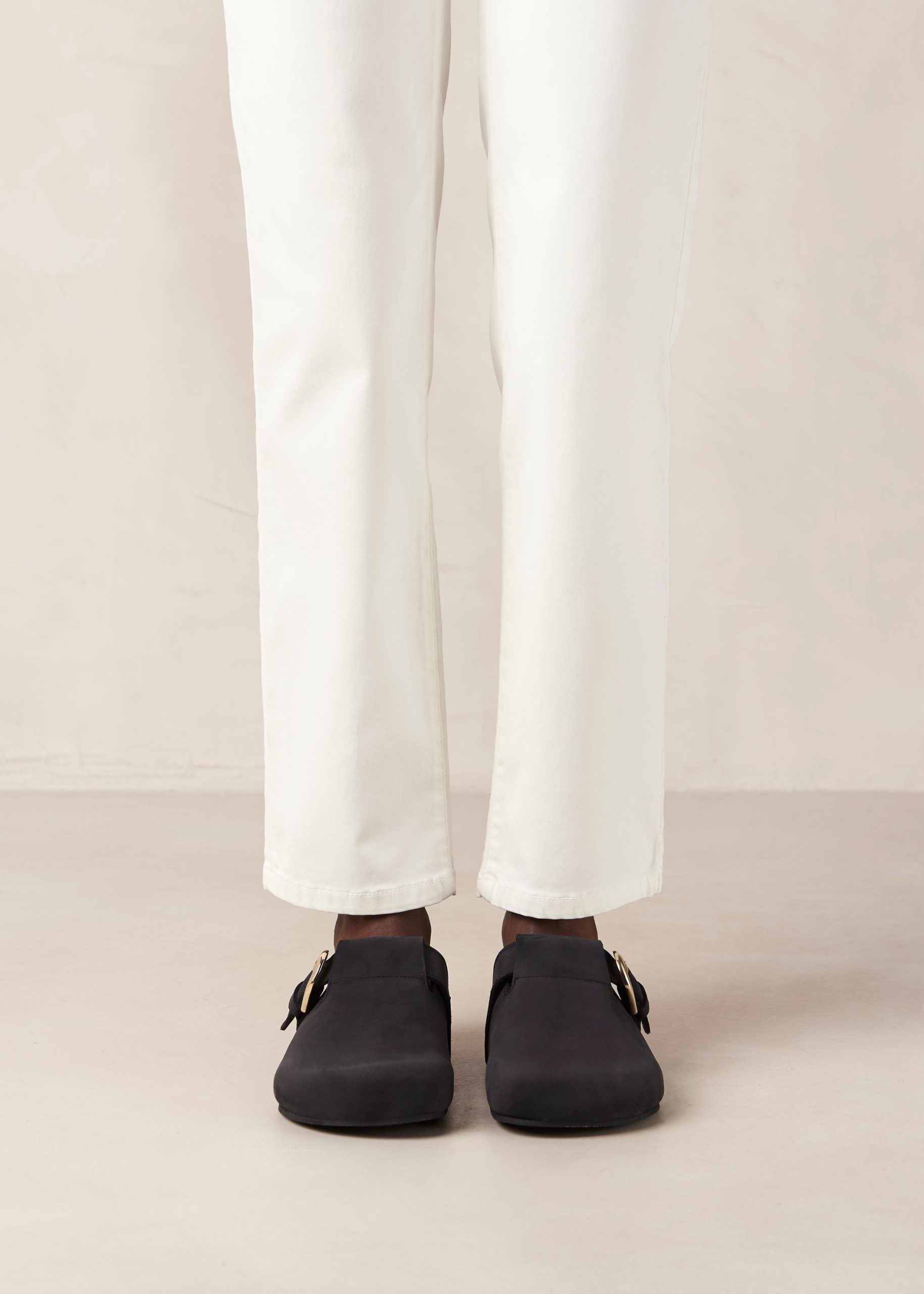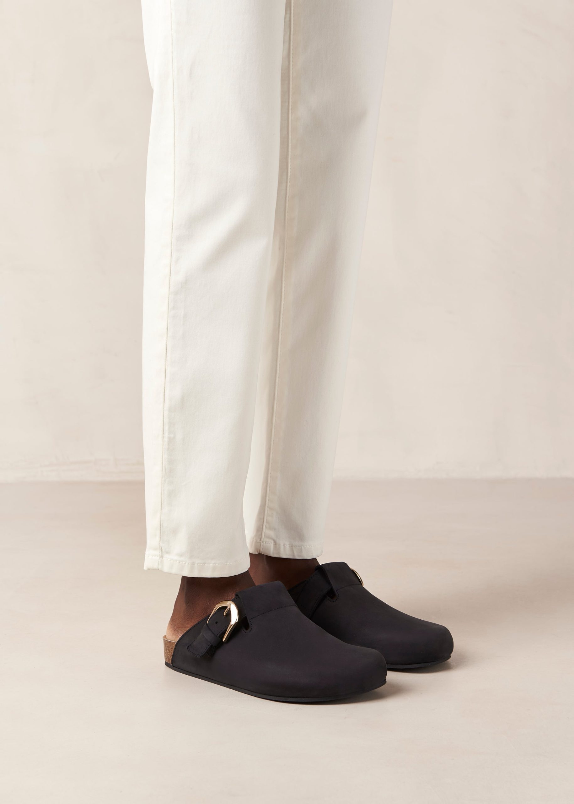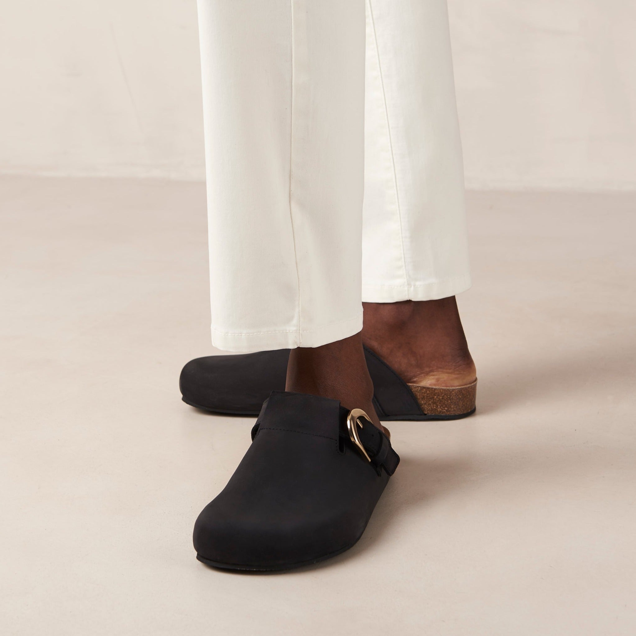 Featuring contoured footbeds and soft insoles. the Travis mule is so comfortable you could wear it as a slipper as well. It’s shaped from black nubuck leather to a closed-toed clog with chunky buckled straps and no back.